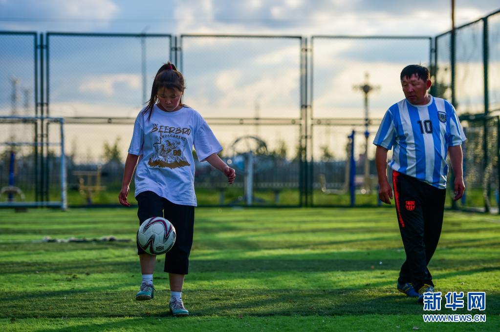 7月26日,吉布斯樂瑪(左)和父親嘎拉巴特爾在錫尼河西蘇木一處足球場踢球。