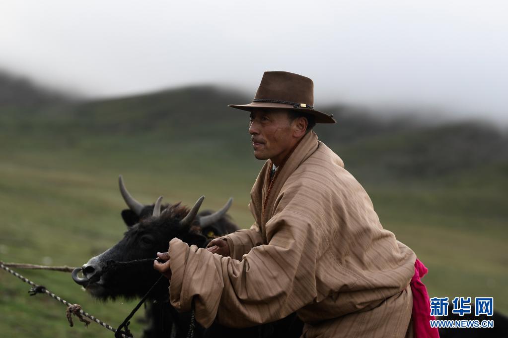 8月3日,在瑪沁縣當洛鄉(xiāng)貢龍村的夏季草場上,牧民在拴牦牛。
