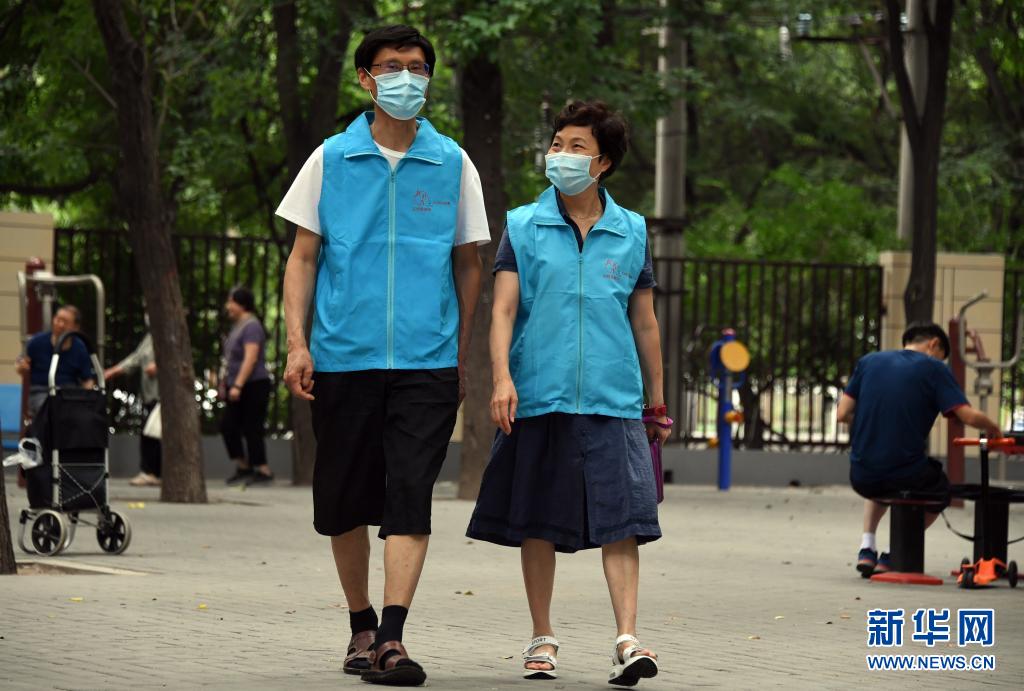 8月14日,在北京市海淀區(qū)薊門(mén)里社區(qū),馮向東與妻子董星梅準(zhǔn)備去做志愿服務(wù)。