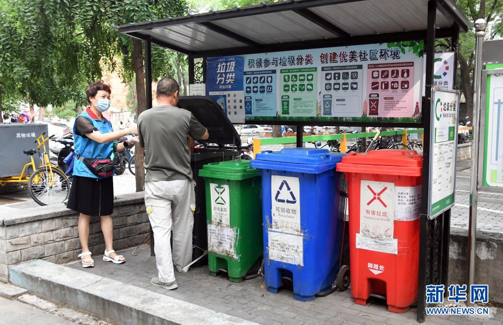在北京市海淀區(qū)薊門里社區(qū),董星梅(左)指導(dǎo)社區(qū)居民進(jìn)行垃圾分類投放(8月11日攝)。