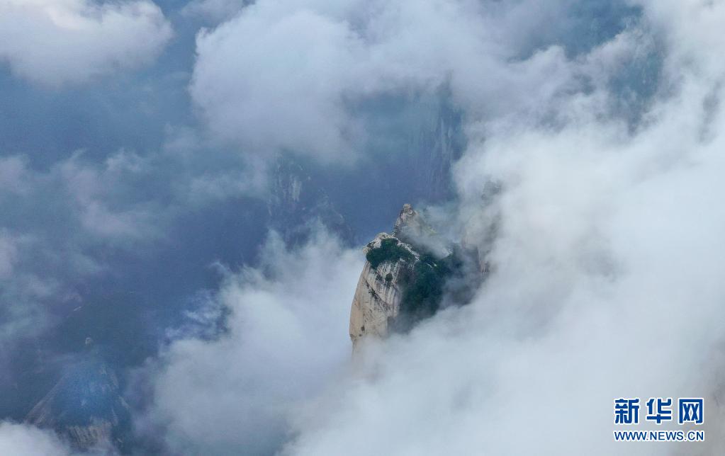 8月14日,云霧中的西岳華山下棋亭(無(wú)人機(jī)照片)。