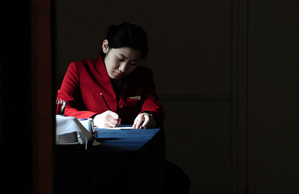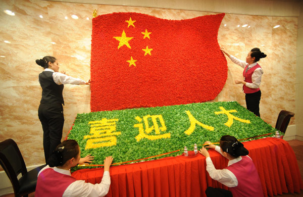 3月2日,京西賓館的服務(wù)員用絹花拼出國旗和“喜迎人大”的圖案。當日,為了迎接全國人大代表入住,京西賓館的服務(wù)員自發(fā)設(shè)計,并從市場上采購來絹花,在餐廳拼出組合圖案,表達“喜迎人大”的心情。