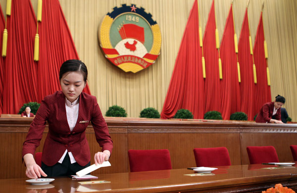3月3日,人民大會堂的工作人員在布置會場。當日15時,中國人民政治協(xié)商會議第十一屆全國委員會第四次會議將在北京人民大會堂開幕。