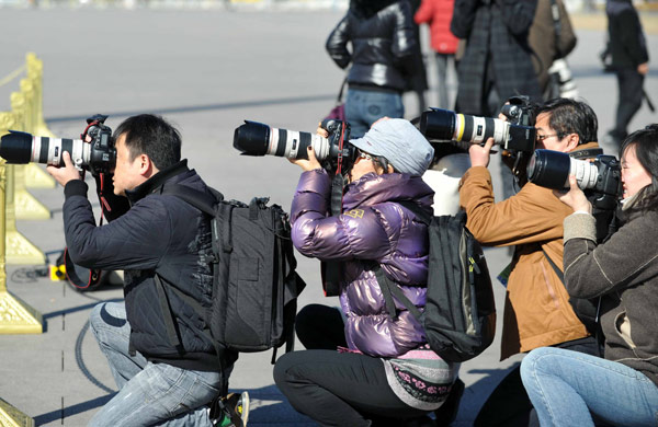 3月3日,4名攝影記者蹲在地上拍照。當日,中國人民政治協(xié)商會議第十一屆全國委員會第四次會議在北京人民大會堂開幕。