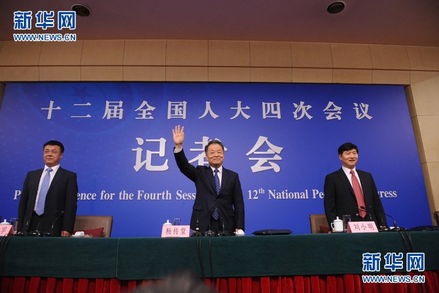 十二屆全國(guó)人大四次會(huì)議新聞中心于3月14日(星期一)10時(shí)在梅地亞中心多功能廳舉行記者會(huì),邀請(qǐng)交通運(yùn)輸部部長(zhǎng)楊傳堂、交通運(yùn)輸部運(yùn)輸服務(wù)司司長(zhǎng)劉小明、北京交通發(fā)展研究中心主任郭繼孚就“深化出租汽車改革與發(fā)展”的相關(guān)問(wèn)題回答中外記者的提問(wèn)。圖為楊傳堂、劉小明、郭繼孚到達(dá)會(huì)場(chǎng),楊傳堂向記者揮手致意。新華網(wǎng)/中國(guó)政府網(wǎng) 陳杰 攝?