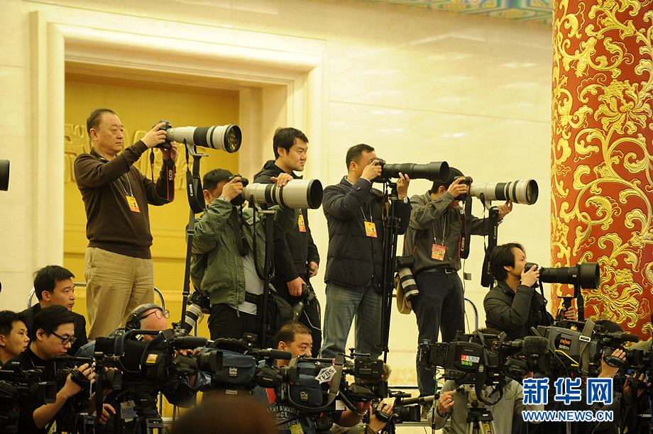 3月16日上午,國務(wù)院總理李克強在人民大會堂三樓金色大廳會見采訪十二屆全國人大四次會議的中外記者并回答記者提出的問題。圖為等待拍照的攝影記者。新華網(wǎng)/中國政府網(wǎng) 陳競超 攝