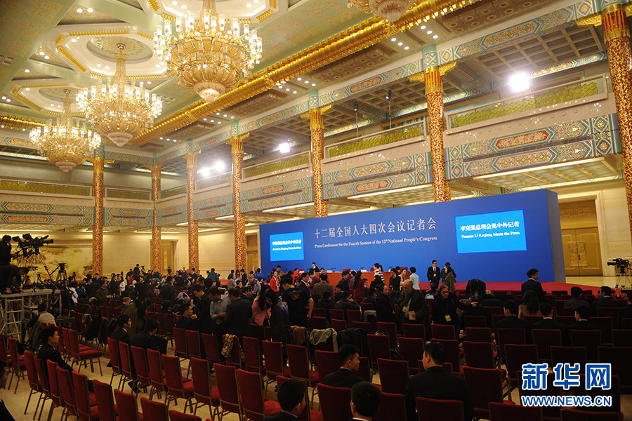3月16日上午,國務院總理李克強在人民大會堂三樓金色大廳會見采訪十二屆全國人大四次會議的中外記者并回答記者提出的問題。圖為記者在準備工作。新華網(wǎng)/中國政府網(wǎng) 陳杰攝