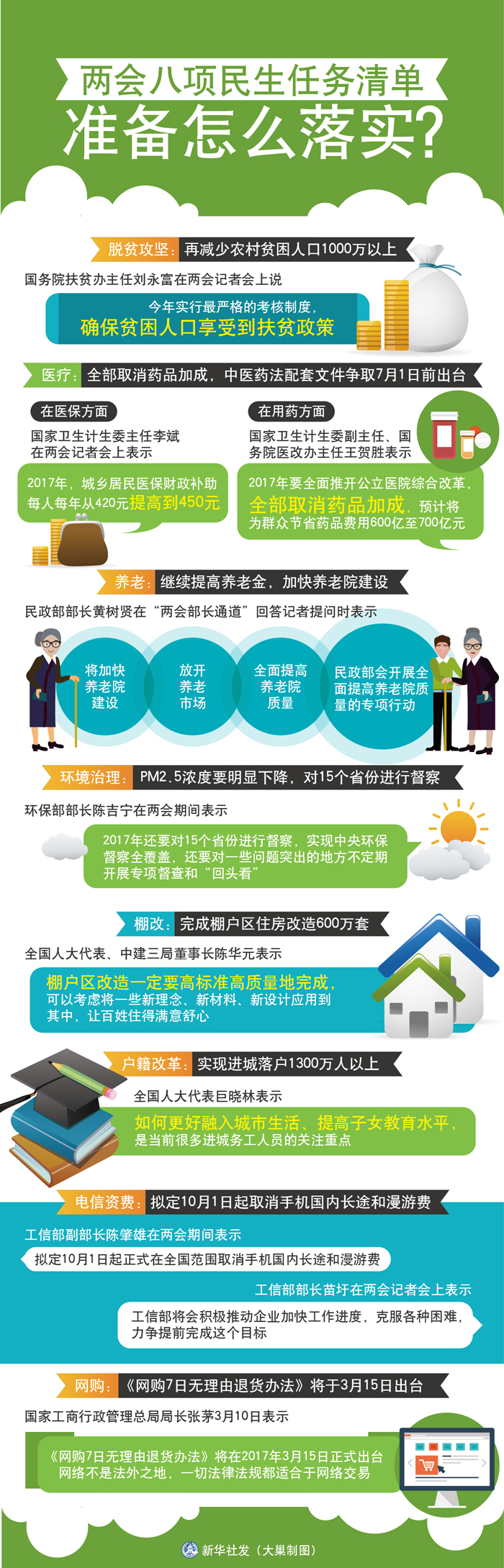 圖表:兩會八項民生任務(wù)清單準(zhǔn)備怎么落實? 新華社發(fā) 大巢制圖