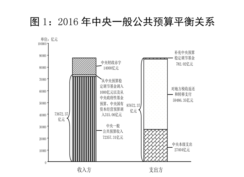 中央一般公共預(yù)算收入72357.31億元,為調(diào)整預(yù)算的100%,比2015年同口徑增長(zhǎng)1.2%。加上從中央預(yù)算穩(wěn)定調(diào)節(jié)基金調(diào)入1000億元,從中央政府性基金預(yù)算、中央國(guó)有資本經(jīng)營(yíng)預(yù)算調(diào)入315.06億元,收入總量為73672.37億元。中央一般公共預(yù)算支出86890.35億元(其中,中央本級(jí)支出27404億元,中央對(duì)地方稅收返還和轉(zhuǎn)移支付59486.35億元),完成調(diào)整預(yù)算的99.1%,增長(zhǎng)4.5%。加上補(bǔ)充中央預(yù)算穩(wěn)定調(diào)節(jié)基金782.02億元,支出總量為87672.37億元。收支總量相抵,中央財(cái)政赤字14000億元,與預(yù)算持平。2016年中央預(yù)備費(fèi)預(yù)算500億元,實(shí)際支出146.1億元,剩余353.9億元全部轉(zhuǎn)入中央預(yù)算穩(wěn)定調(diào)節(jié)基金。2016年末,中央財(cái)政國(guó)債余額120066.75億元,控制在年度預(yù)算限額125908.35億元以內(nèi);中央預(yù)算穩(wěn)定調(diào)節(jié)基金余額2678.06億元(含通過收回中央財(cái)政結(jié)轉(zhuǎn)資金補(bǔ)充1501.83億元)。