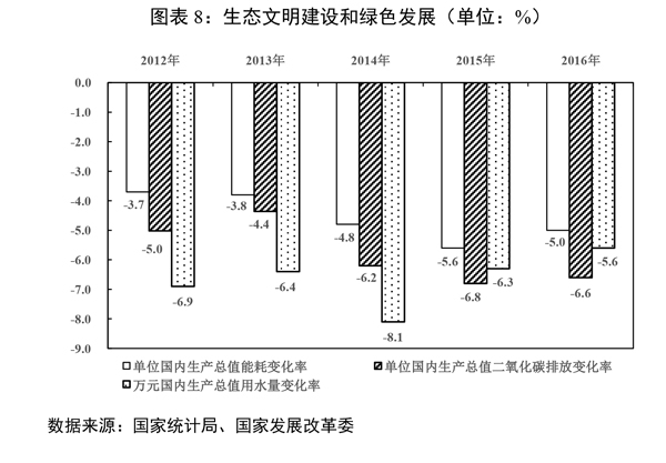 ?。ㄆ撸┘訌?qiáng)生態(tài)環(huán)境保護(hù)和能源資源節(jié)約,綠色發(fā)展初見(jiàn)成效。單位國(guó)內(nèi)生產(chǎn)總值能耗和二氧化碳排放量分別下降5%和6.6%,超額完成全年目標(biāo),化學(xué)需氧量、氨氮、二氧化硫、氮氧化物排放量預(yù)計(jì)分別下降2.6%、2.9%、5.6%、4.0%,地級(jí)及以上城市空氣質(zhì)量?jī)?yōu)良天數(shù)比例同比提高2.1個(gè)百分點(diǎn),74個(gè)重點(diǎn)城市細(xì)顆粒物(PM2.5)年均濃度下降9.1%,地表水達(dá)到或好于Ⅲ類(lèi)水體比例同比提高1.8個(gè)百分點(diǎn)、劣Ⅴ類(lèi)水體比例同比下降1.1個(gè)百分點(diǎn),萬(wàn)元國(guó)內(nèi)生產(chǎn)總值用水量下降5.6%。