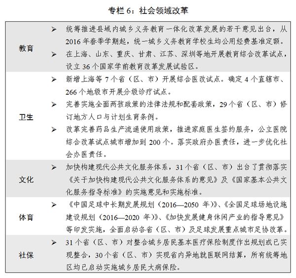 七是社會(huì)領(lǐng)域改革加快推進(jìn)。中央和國(guó)家機(jī)關(guān)公務(wù)用車(chē)制度改革全面完成,地方黨政機(jī)關(guān)公車(chē)改革深入推進(jìn)。行業(yè)協(xié)會(huì)商會(huì)與行政機(jī)關(guān)脫鉤改革第二批試點(diǎn)啟動(dòng)實(shí)施。加快不動(dòng)產(chǎn)統(tǒng)一登記制度落地,全國(guó)100%的地(市、州)、98%的縣(市、區(qū))實(shí)現(xiàn)“發(fā)新停舊”。國(guó)家科技計(jì)劃管理改革繼續(xù)深化,以增加知識(shí)價(jià)值為導(dǎo)向的分配政策出臺(tái),科技成果轉(zhuǎn)化力度加大。教育領(lǐng)域綜合改革向縱深推進(jìn)。分級(jí)診療制度建設(shè)持續(xù)推進(jìn),城鄉(xiāng)居民基本醫(yī)療保險(xiǎn)制度整合取得實(shí)質(zhì)性進(jìn)展,個(gè)人衛(wèi)生支出占衛(wèi)生總費(fèi)用的比重下降到28.9%?!秶?guó)務(wù)院辦公廳關(guān)于全面放開(kāi)養(yǎng)老服務(wù)市場(chǎng)提升養(yǎng)老服務(wù)質(zhì)量的若干意見(jiàn)》(國(guó)辦發(fā)〔2016〕91號(hào))印發(fā)實(shí)施。穩(wěn)步推進(jìn)機(jī)關(guān)事業(yè)單位養(yǎng)老保險(xiǎn)制度改革。加快構(gòu)建中國(guó)特色哲學(xué)社會(huì)科學(xué),實(shí)施哲學(xué)社會(huì)科學(xué)創(chuàng)新工程。足球改革加快推進(jìn)。