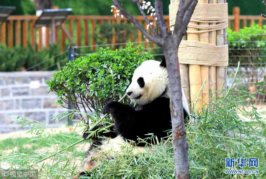 3月27日,山東濟(jì)南春暖花開(kāi),動(dòng)物園內(nèi)熊貓?jiān)趫@中散步吃美食享受春天美好陽(yáng)光。(圖片來(lái)源:視覺(jué)中國(guó))