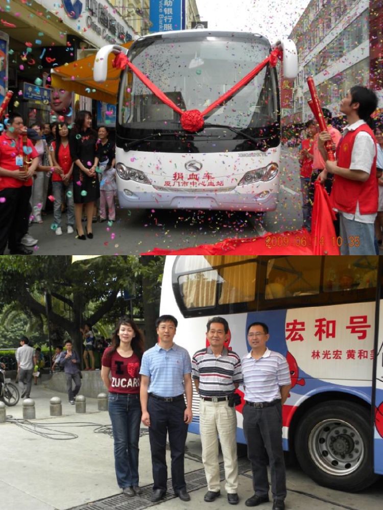 上圖:廈門臺商林姵蓁捐贈了大型獻血車。下圖:林姵蓁(左一)和爸爸(左三)在“宏和號”獻血車旁合影留念。(受訪者供圖)