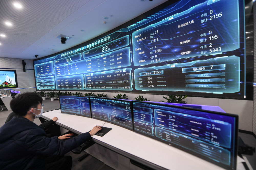 4月2日,在杭州市余杭區(qū)疫情防控工作領(lǐng)導(dǎo)小組指揮部?jī)?nèi),杭州城市大腦精密智控防疫系統(tǒng)顯示疫情防控動(dòng)態(tài)各項(xiàng)實(shí)時(shí)數(shù)據(jù)。新華社記者 徐昱 攝