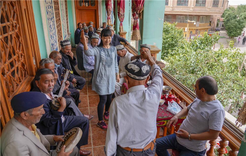 在新疆喀什老城的“百年茶館”,游客和當(dāng)?shù)夭杩瓦吰凡柽呅蓍e(5月17日攝)。新華社記者 趙戈 攝