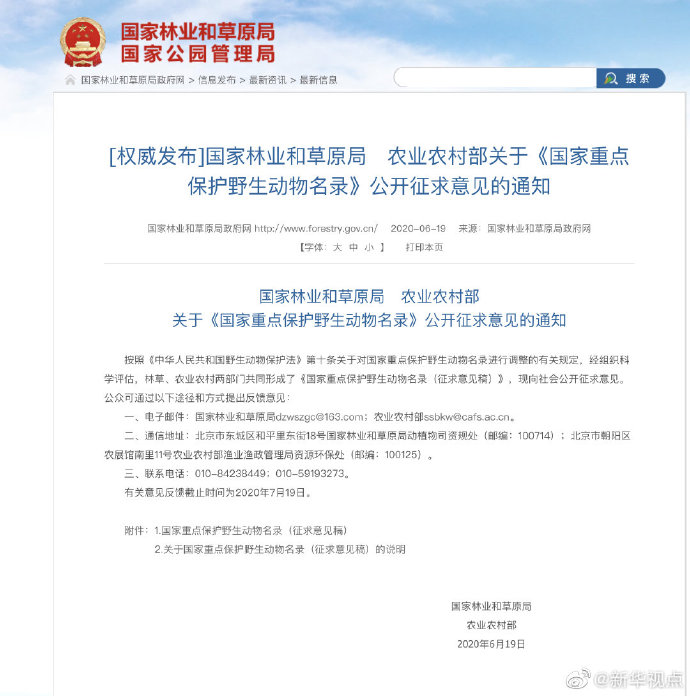 這些調(diào)整你同意嗎?公眾可通過(guò)以下途徑和方式提出反饋意見:一、電子郵件:國(guó)家林業(yè)和草原局dzwszgc@163.com;農(nóng)業(yè)農(nóng)村部ssbkw@cafs.ac.cn。二、通信地址:北京市東城區(qū)和平里東街18號(hào)國(guó)家林業(yè)和草原局動(dòng)植物司資規(guī)處(郵編:100714);北京市朝陽(yáng)區(qū)農(nóng)展館南里11號(hào)農(nóng)業(yè)農(nóng)村部漁業(yè)漁政管理局資源環(huán)保處(郵編:100125)。三、聯(lián)系電話:010-84238449;010-59193273。有關(guān)意見反饋截止時(shí)間為2020年7月19日。(記者胡璐)