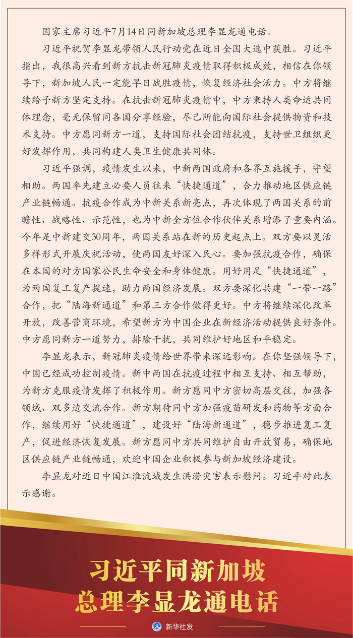 新華社北京7月14日電 國(guó)家主席習(xí)近平7月14日同新加坡總理李顯龍通電話(huà)。