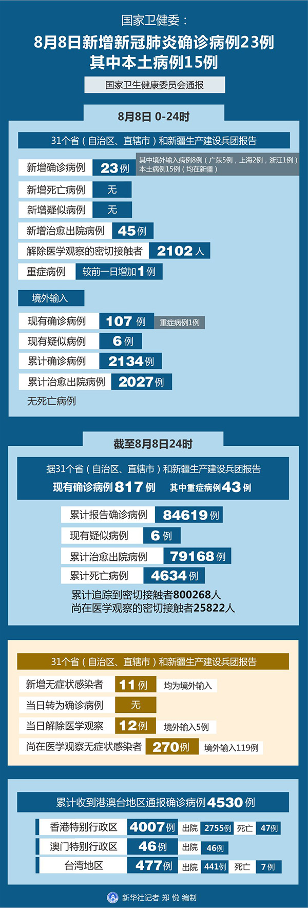 截至8月8日24時(shí),據(jù)31個?。ㄗ灾螀^(qū)、直轄市)和新疆生產(chǎn)建設(shè)兵團(tuán)報(bào)告,現(xiàn)有確診病例817例(其中重癥病例43例),累計(jì)治愈出院病例79168例,累計(jì)死亡病例4634例,累計(jì)報(bào)告確診病例84619例,現(xiàn)有疑似病例6例。累計(jì)追蹤到密切接觸者800268人,尚在醫(yī)學(xué)觀察的密切接觸者25822人。