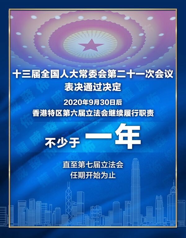 根據決定,2020年9月30日后,香港特別行政區(qū)第六屆立法會繼續(xù)履行職責,不少于一年,直至香港特別行政區(qū)第七屆立法會任期開始為止。香港特別行政區(qū)第七屆立法會依法產生后,任期仍為四年。