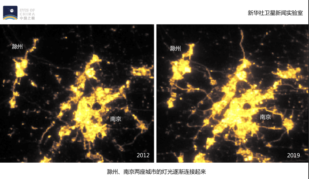 滁州,地處皖東,與南京相鄰。從2012年至2019年,這兩座城市的光亮邊緣不斷延伸,直至逐漸融合,“你中有我,我中有你”。數(shù)據(jù)顯示,滁州市燈光亮度值7年間約增加112%。