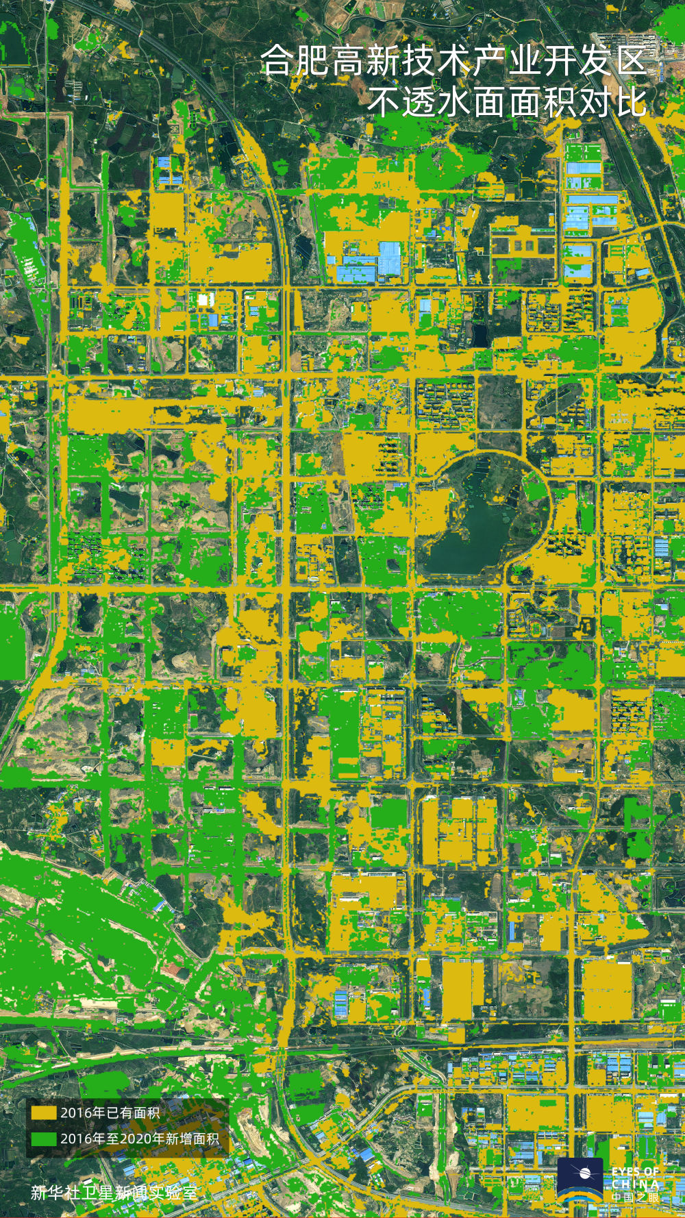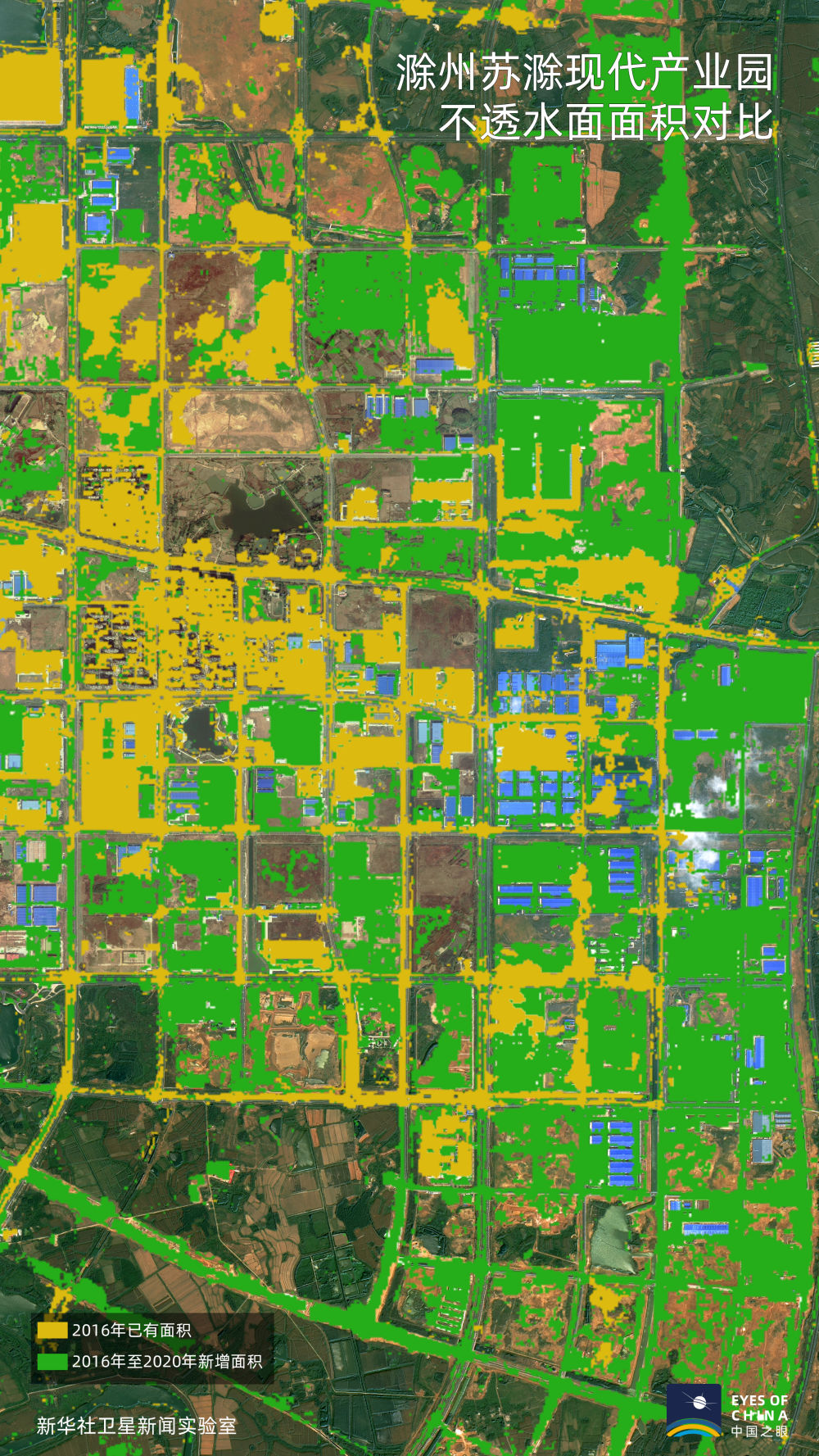 黃色覆蓋區(qū)域為2016年已有不透水面區(qū)域,綠色為2020年較2016年新增區(qū)域。大幅增加的綠色顯示,滁州和合肥的工業(yè)園區(qū)范圍在快速向外延伸,經(jīng)濟發(fā)展邁上新臺階。