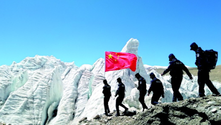 阿旺平措第一次巡邏,是索朗達(dá)杰帶的隊(duì)。在崗布冰川的石頭上,他們用紅色噴漆寫下“中國(guó)”字樣,還畫上了國(guó)旗。