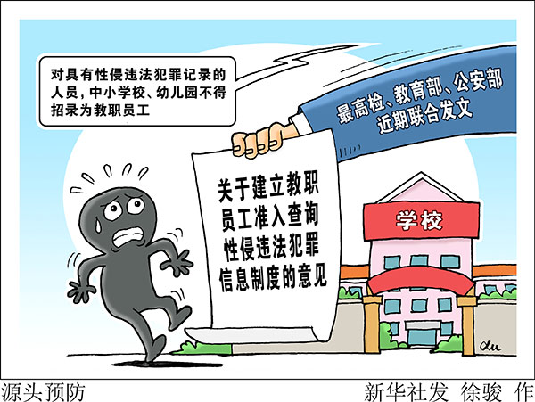 新華社北京9月18日電(記者陳菲)為加強對性侵未成年人犯罪的源頭預(yù)防,最高檢、教育部、公安部近期聯(lián)合發(fā)文,要求在全國建立入職查詢制度,對具有性侵違法犯罪記錄的人員,中小學(xué)校、幼兒園不得錄用,教師認定機構(gòu)不得認定教師資格。
