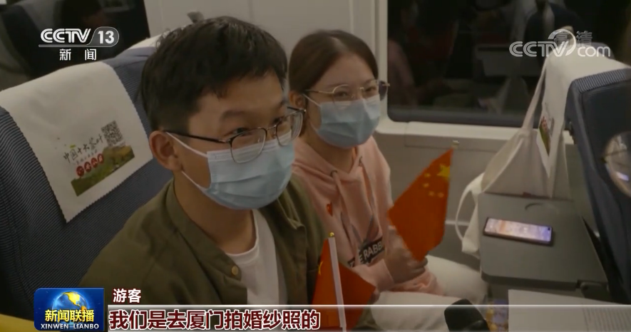 游客:我們是去廈門拍婚紗照的,沿邊的風(fēng)景都很好看,我們剛才把五星紅旗跟藍(lán)天還比著,拍了個(gè)照片,每天都讓我們自己有種愛上祖國(guó)新的那種感動(dòng)。