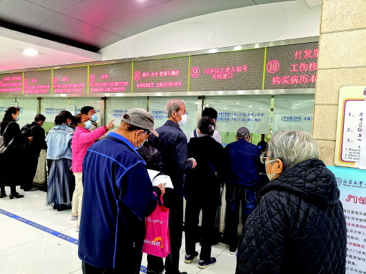 此時(shí),這家醫(yī)院唯一一個(gè)現(xiàn)場(chǎng)掛號(hào)的窗口——面向70周歲以上老年人的窗口,已經(jīng)排起了長隊(duì)。老人們一個(gè)比一個(gè)來得早,仍有點(diǎn)兒神色緊張。