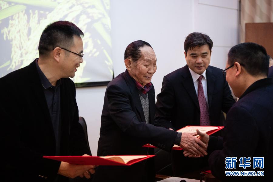 11月13日,在湖南雜交水稻研究中心舉行的“袁隆平農(nóng)業(yè)科技獎”頒獎儀式上,袁隆平(左二)給獲獎人員頒獎。新華社記者 陳思汗 攝