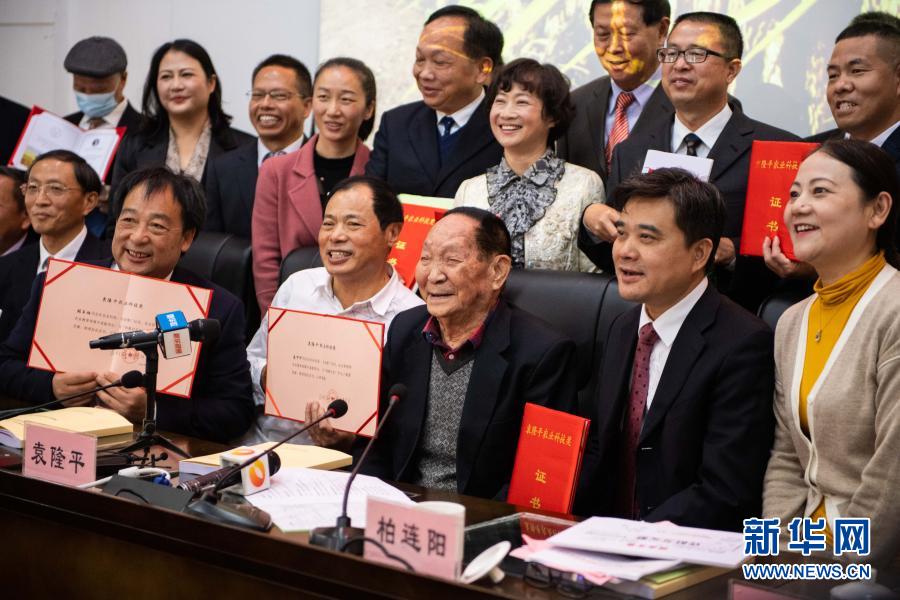 11月13日,在湖南雜交水稻研究中心舉行的“袁隆平農(nóng)業(yè)科技獎”頒獎儀式上,袁隆平(前排右三)和獲獎人員合影。新華社記者 陳思汗 攝