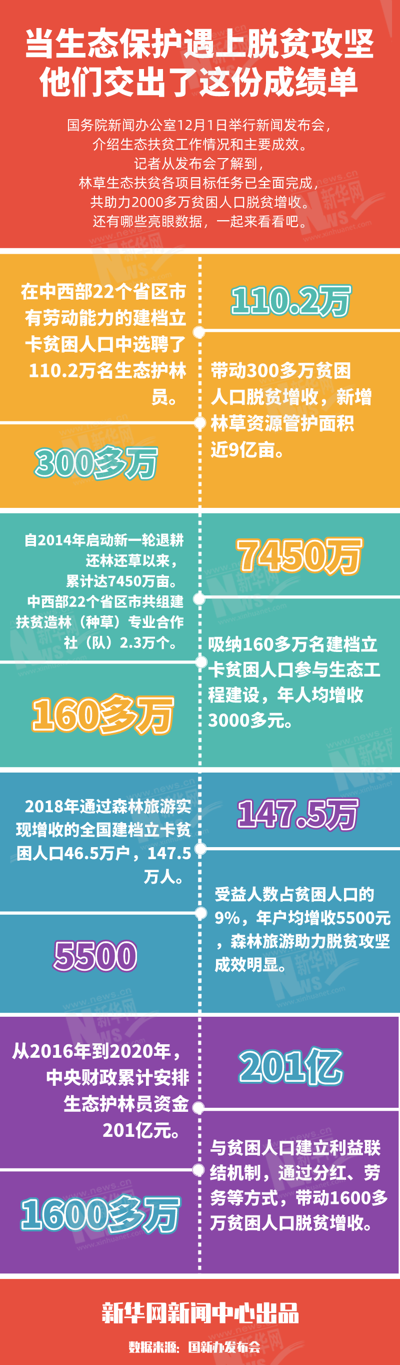 新華網(wǎng)北京12月1日電(汪亞)國務(wù)院新聞辦公室于今日舉行新聞發(fā)布會,介紹生態(tài)扶貧工作情況和主要成效。國家林業(yè)和草原局副局長李春良在發(fā)布會透露,黨的十八大以來,林草生態(tài)扶貧各項目標(biāo)任務(wù)全面完成,在推進(jìn)生態(tài)補償扶貧、推進(jìn)國土綠化扶貧、推進(jìn)生態(tài)產(chǎn)業(yè)扶貧、推進(jìn)定點幫扶縣脫貧摘帽等四大方面發(fā)力,共助力2000多萬貧困人口脫貧增收。