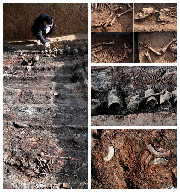 左圖為工作人員在清理河南洛陽徐陽墓地標(biāo)號(hào)為M15的墓葬;右上圖為河南洛陽徐陽墓地標(biāo)號(hào)為M15的墓葬周邊祭祀遺存內(nèi)出土的動(dòng)物遺?。挥抑袌D為河南洛陽徐陽墓地標(biāo)號(hào)為M15的墓葬出土的編鐘;右下圖為河南洛陽徐陽墓地標(biāo)號(hào)為M15的墓葬出土的玉璜