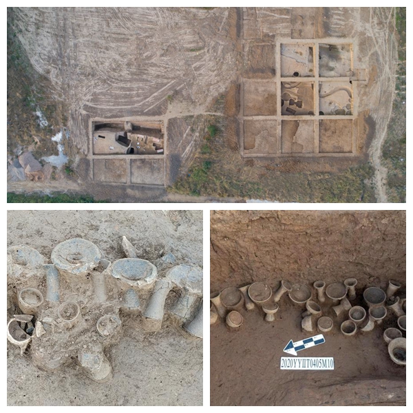 上圖為余莊遺址發(fā)掘區(qū)航拍圖(11月3日攝,無人機(jī)照片);左下圖為余莊遺址標(biāo)號(hào)為T0405的探方出土的陶器;右下圖為余莊遺址標(biāo)號(hào)為M10的墓葬出土的隨葬陶器