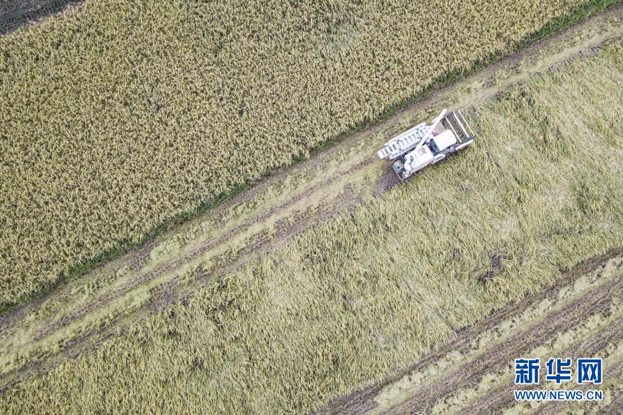 10月22日,工作人員駕駛收割機(jī)在海南??邶埲A區(qū)龍泉鎮(zhèn)新江村收割晚稻(無(wú)人機(jī)照片)。