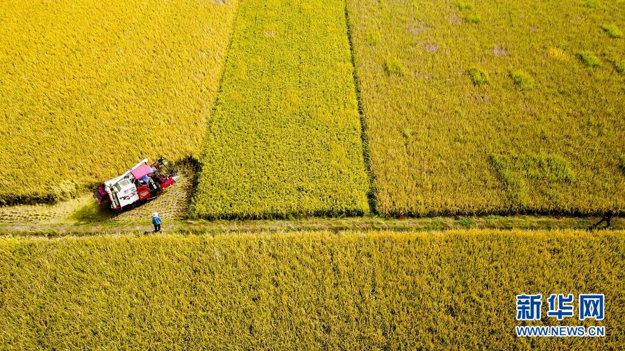 10月21日,在棗莊市臺兒莊區(qū)邳莊鎮(zhèn),收割機在收獲水稻(無人機照片)。