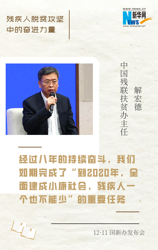 新華網(wǎng)北京12月11日電(王瑩)在脫貧攻堅的戰(zhàn)場上,涌現(xiàn)出許多殘疾人自強脫貧的先進典型和脫貧攻堅一線奮力拼搏的工作者。12月11日上午,國新辦邀請到他們中的4位代表,圍繞“殘疾人脫貧攻堅中的奮進力量”與中外記者見面交流。一起來聽他們的脫貧故事和脫貧經(jīng)驗。