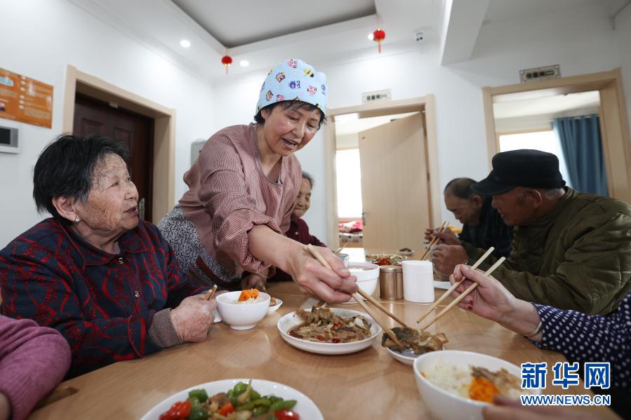 10月22日,西寧市城西區(qū)溫馨陽光托老所內(nèi),護(hù)理員張蓉霞(左二)在用公筷為老人們夾菜。新華社記者 吳剛 攝
