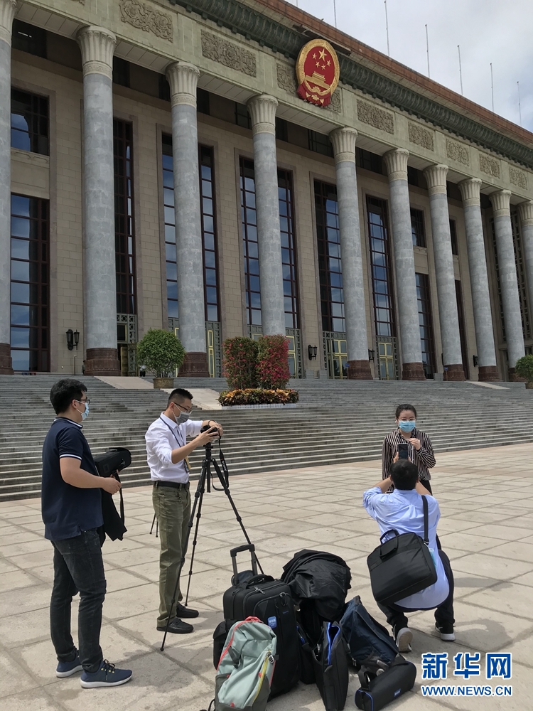 5月20日,全國(guó)政協(xié)十三屆三次會(huì)議召開(kāi)新聞發(fā)布會(huì)。大會(huì)新聞發(fā)言人郭衛(wèi)民向中外媒體介紹本次大會(huì)有關(guān)情況并回答記者提問(wèn)。圖為本網(wǎng)記者在人民大會(huì)堂東門(mén)外廣場(chǎng)做直播前準(zhǔn)備工作。新華網(wǎng)記者 周紅軍? 攝