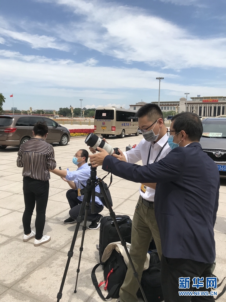 5月20日,全國政協(xié)十三屆三次會議召開新聞發(fā)布會。大會新聞發(fā)言人郭衛(wèi)民向中外媒體介紹本次大會有關(guān)情況并回答記者提問。圖為本網(wǎng)記者在人民大會堂東門外廣場做直播前準(zhǔn)備工作。新華網(wǎng)記者 周紅軍? 攝