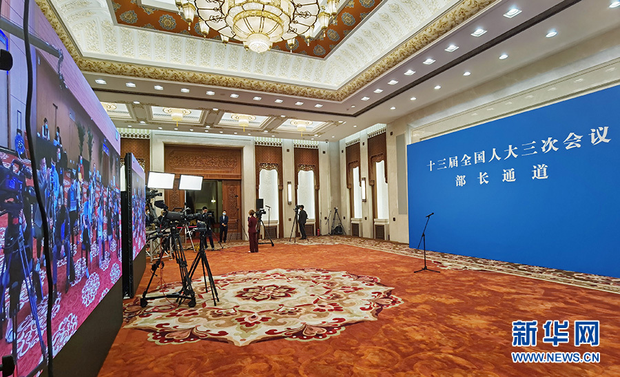5月22日,十三屆全國人大三次會(huì)議開幕會(huì)結(jié)束后,首場(chǎng)“部長(zhǎng)通道”采訪活動(dòng)在人民大會(huì)堂新聞發(fā)布廳舉行,邀請(qǐng)部分列席會(huì)議的國務(wù)院有關(guān)部委負(fù)責(zé)人通過網(wǎng)絡(luò)視頻方式接受采訪。圖為“部長(zhǎng)通道”現(xiàn)場(chǎng)。新華網(wǎng) 王翰林 攝