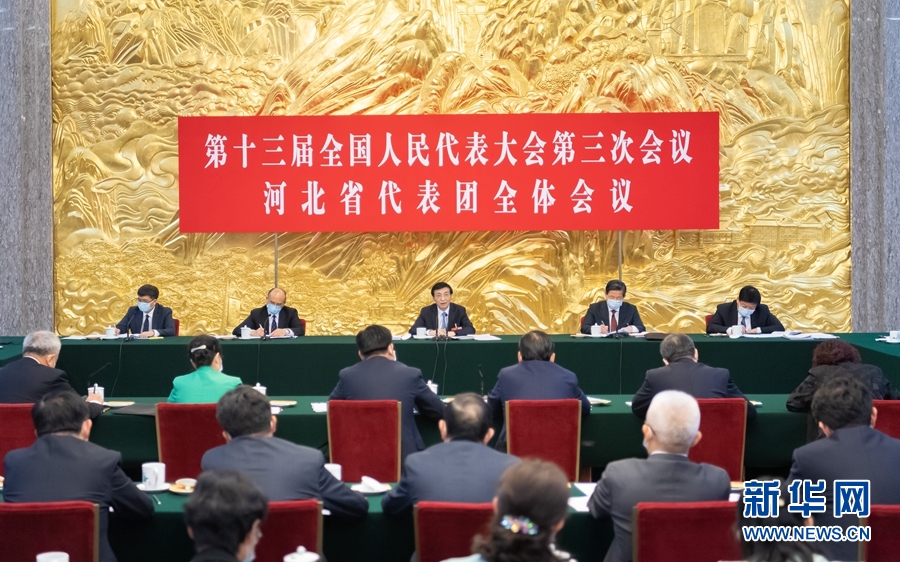 5月22日,中共中央政治局常委、中央書記處書記王滬寧參加十三屆全國人大三次會(huì)議河北代表團(tuán)的審議。 新華社記者 翟健嵐 攝