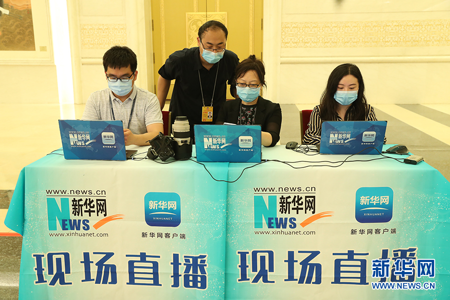 2020年5月28日下午十三屆全國人大三次會議閉幕后,國務(wù)院總理李克強(qiáng)在人民大會堂三樓金色大廳出席記者會并回答中外記者提問。為有效防控疫情,共同維護(hù)公共衛(wèi)生與健康,記者會采用網(wǎng)絡(luò)視頻形式進(jìn)行。圖為新華網(wǎng)現(xiàn)場直播團(tuán)隊(duì)。 新華網(wǎng) 王翰林 攝