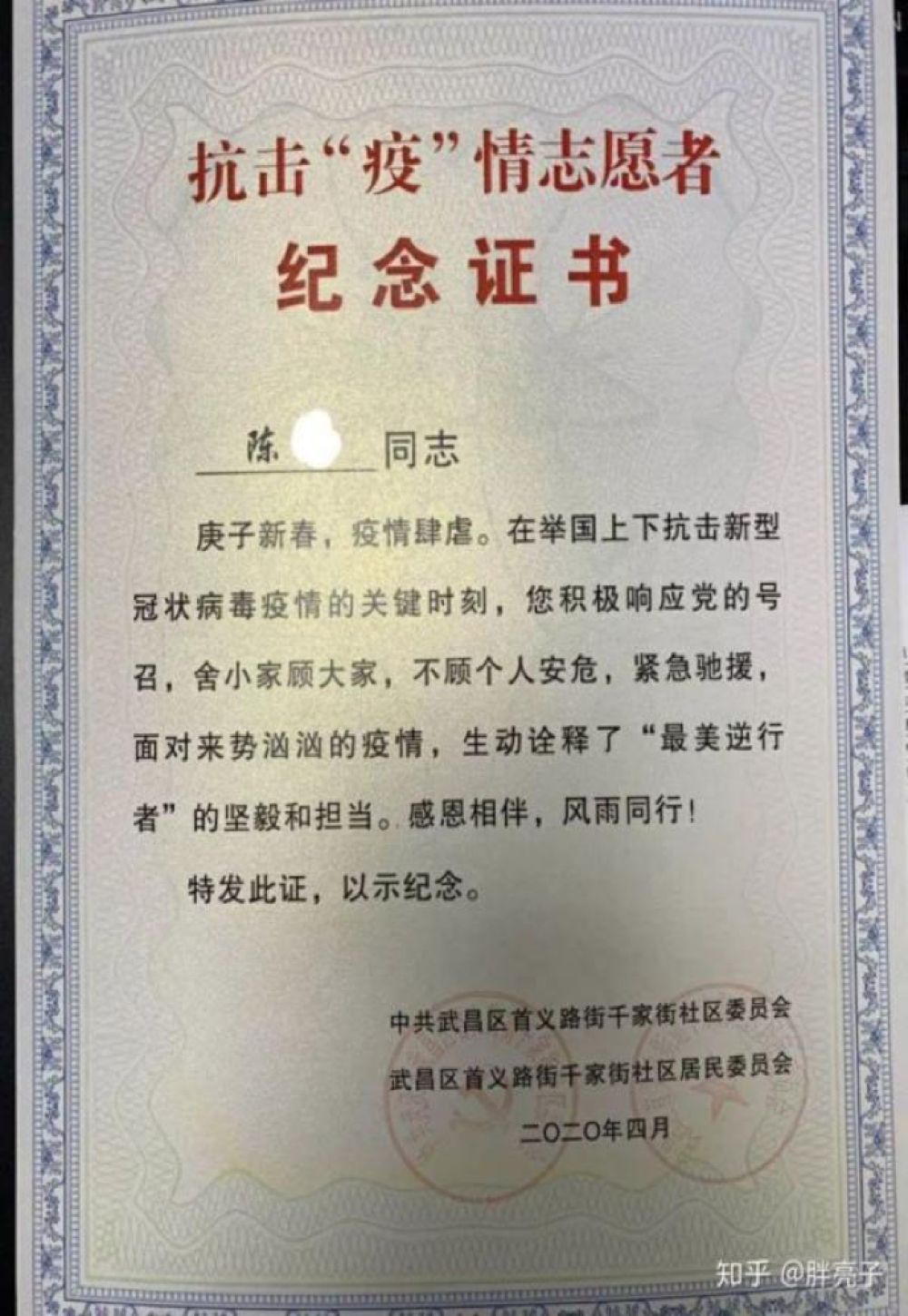 在武漢,網(wǎng)友“胖亮子”說(shuō),2月底,他的妻子接到下沉社區(qū)做志愿者的通知,可以自愿選擇,但她很快答應(yīng)了?!捌綍r(shí)有點(diǎn)潔癖而且膽小的老婆在這個(gè)時(shí)候能夠挺身而出,讓我刮目相看?!?