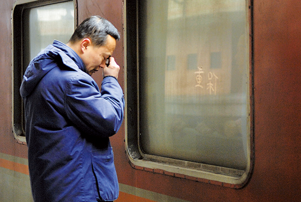 這時乘客們已經(jīng)基本都上車,站臺上留下不多的送站旅客。車窗里兩位老人,一位正在擦拭眼睛,另一位在小本子上寫字,再透過窗戶拿給車外的中年男子看。兩位老人揮手讓站臺上的男子先走,他卻一直站著,不斷低頭拭淚。小小的車窗成為臨別溝通的橋梁,玻璃上的“保重”則是他們對彼此最深情的叮囑。