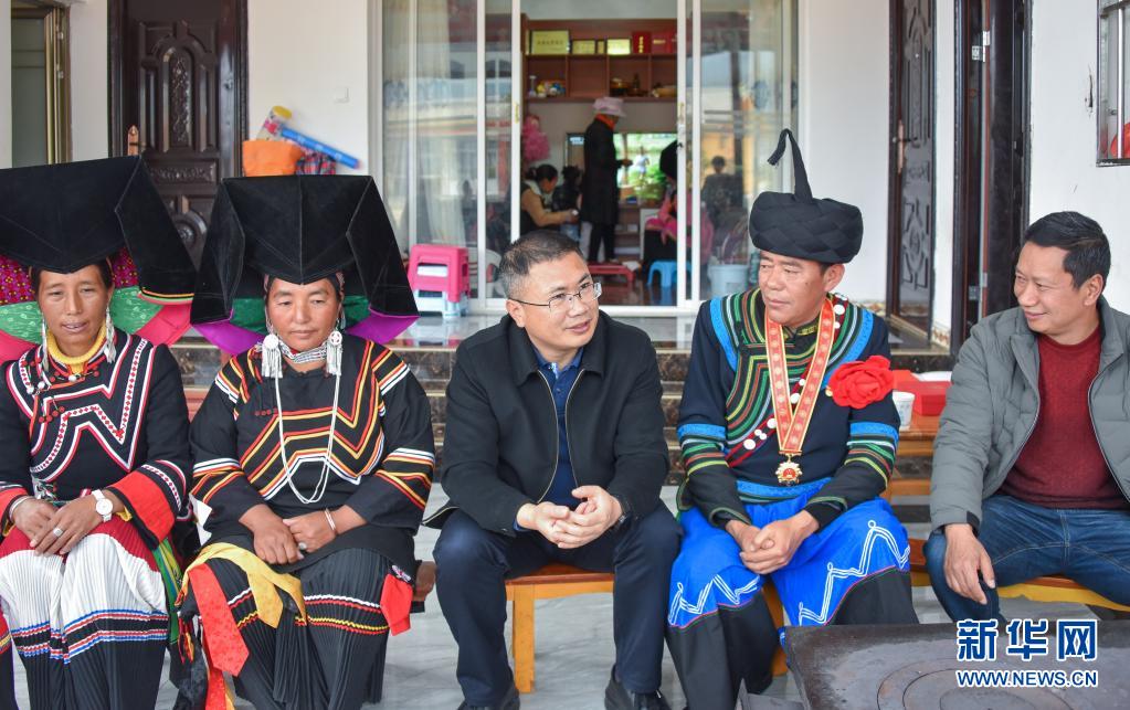 聶金輝(中)在老君山鎮(zhèn)新和村易地扶貧搬遷安置點索瑪小鎮(zhèn)看望慰問彝族群眾(3月3日攝)。新華社發(fā)(劍川縣融媒體中心供圖)