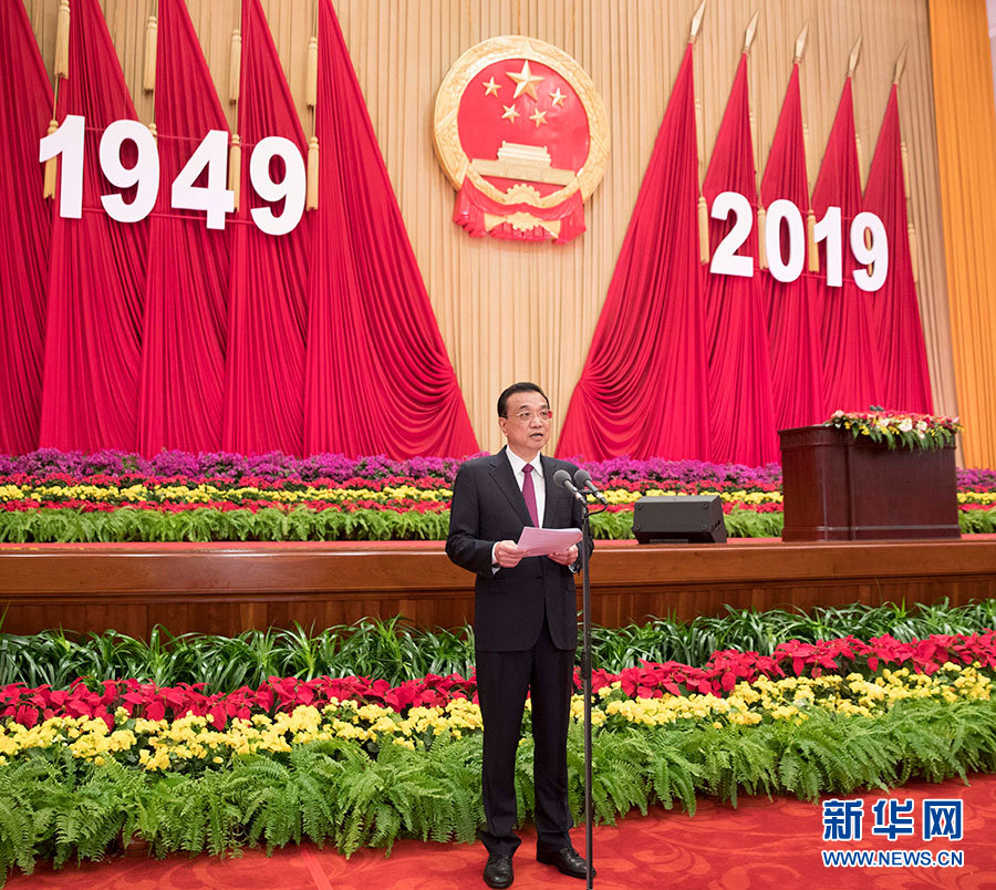 李克強(qiáng)主持招待會(huì),栗戰(zhàn)書、汪洋、王滬寧、趙樂際、韓正、王岐山出席招待會(huì)。4000余名中外人士歡聚一堂,共慶新中國70華誕。