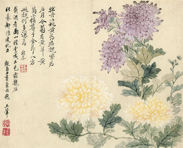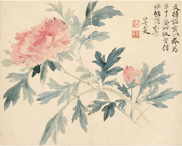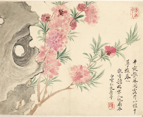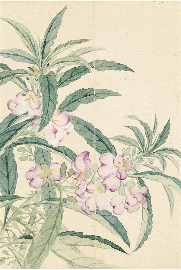 恽寿平的《瓯香馆写生册》,天津博物馆藏,描写了四时的花果。从春夏到秋冬分别是桃花、海棠、碧海珊瑚、牡丹、枇杷、卷丹、洛阳花、凤仙花、菊花、梅花。作品用笔清劲秀逸,而不见笔墨痕迹,设色醇厚鲜丽,清新古雅,令人眼目一新。