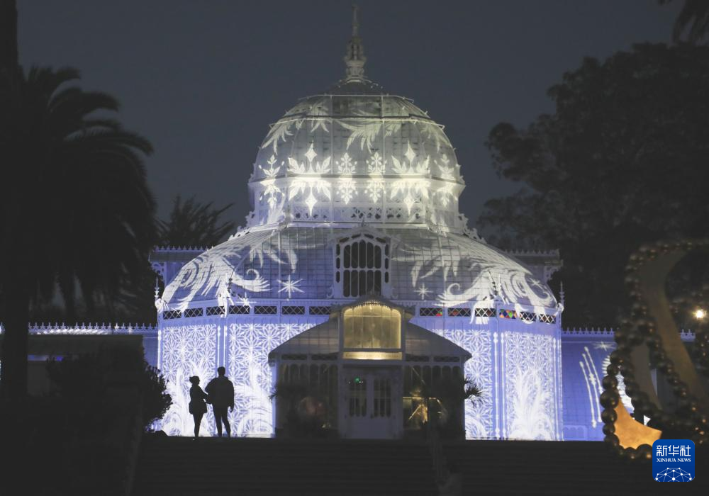 12月15日,美国旧金山金门公园花卉温室举行灯光秀,增添节日气氛,吸引人们前去观赏。