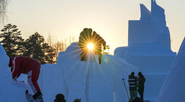 这是在哈尔滨市兆麟公园举办的第52届哈尔滨冰灯艺术游园会上展出的冰雕作品(1月14日摄)。
